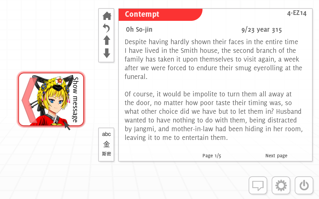 But while I may not have been able to pass judgement, the AI companions *Hyun-ae and *Mute are all to happy to react with strong judgements of their own. They take the stories you read and, by reacting to them, each casts them in a different light. The former has nothing but contempt for the culture and the people of the Mugunghwa, and the latter vociferously defends the status quo, including the way people were treated aboard the ship.