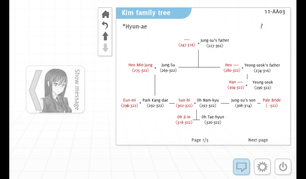 The stories you begin to uncover – the long-running feuds between the Kims and the Smiths, the mystery of the Pale Bride, a secret and dishonourable love – are invariably fascinating reading, shaped at all times as they are by the limitations and the harshness of the culture of the Mugunghwa‘s. And Christine Love (Analogue’s creator) has a real talent for speaking in the voices of the varied characters that make up these stories. The strong, rebellious women, the stony patriarchs, and everyone in between – all of them are believable, and understandable as human beings shaped by the wider cultural framework they inhabit. Many of them are horrendous people, but I found them so human – in many cases so pitiable – that I couldn’t bring myself to judge them.