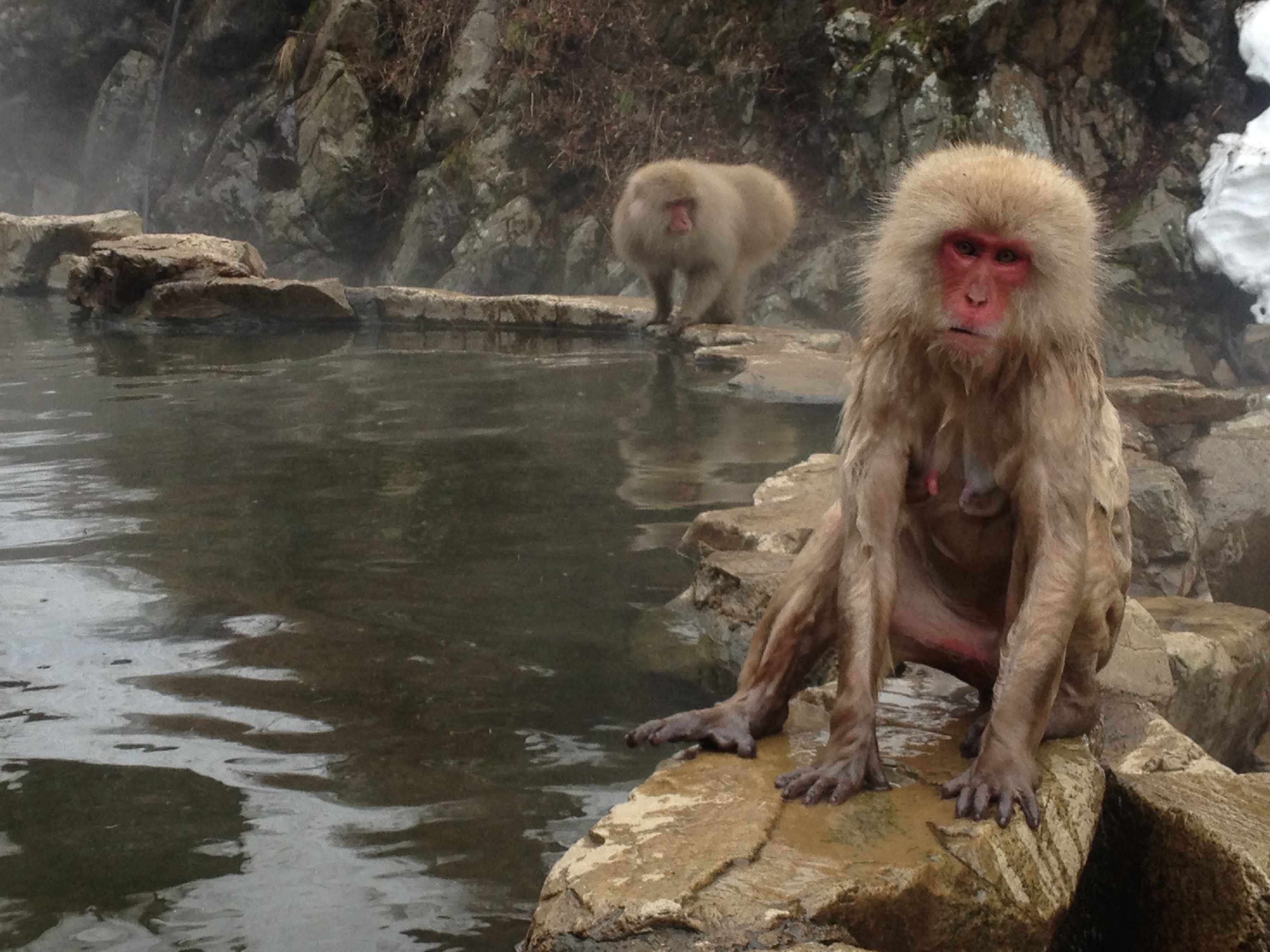 When we got off the train, however, we found that Yamanouchi itself was very nice, with interesting-looking narrow streets, and steam from the underground hot springs rising from manhole covers. And soon enough we learned that the nearby Shiga-kōgen ski park was still snowy and open for business. After an all-too-brief encounter with the owner of our hotel – a man who spoke good English, but who spoke in such unusual ways that we could never tell if he was just slightly eccentric or if he was constantly and subtly mocking us – we were off to see the famed bathing monkeys of Joshinetsu Kogen National Park.