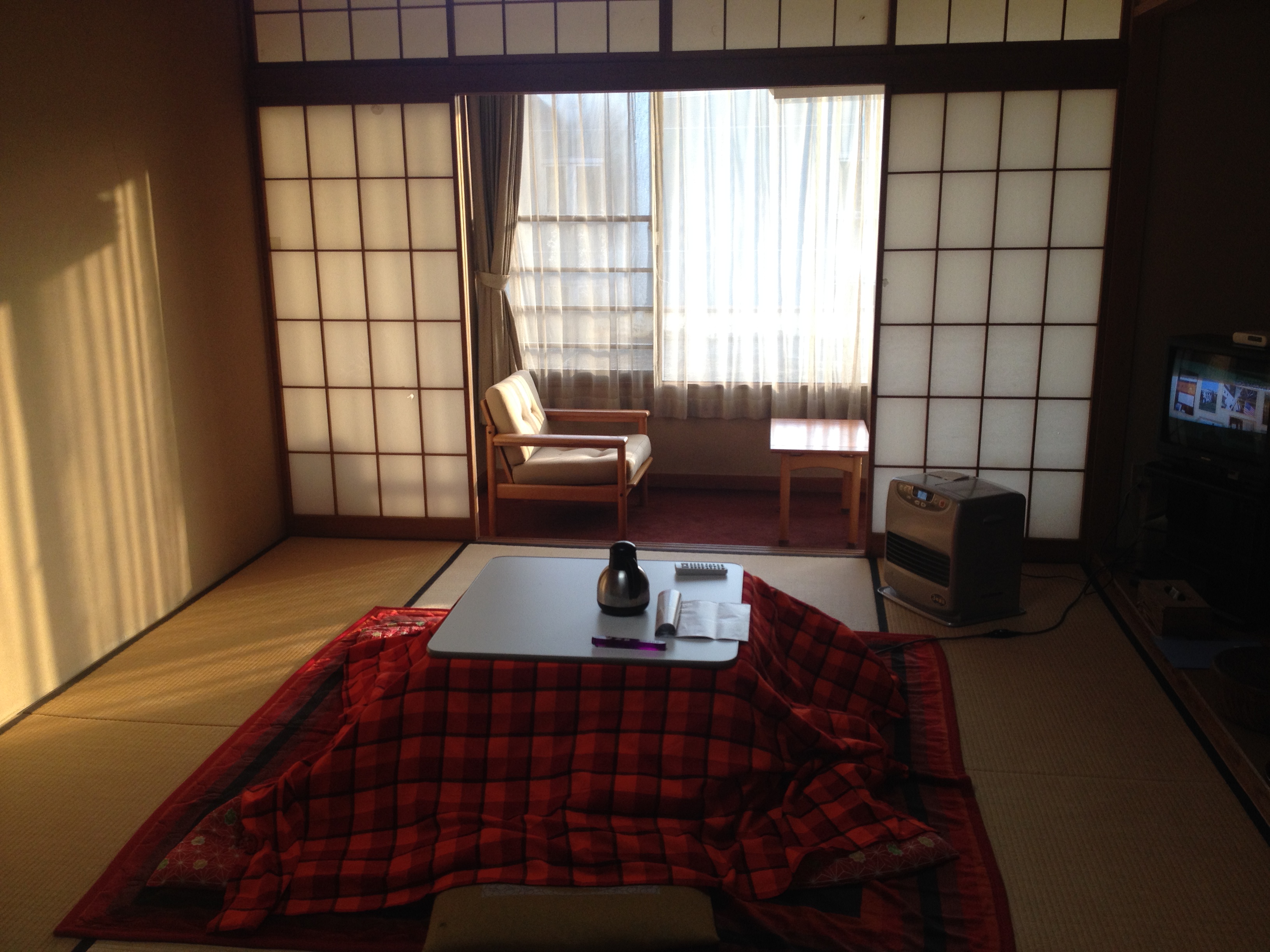 Both exhausted after around six hours of solid skiing, we decided to go to the Yudanaka public baths, which were free for anyone staying in a hotel in the area. I had a great time, sequestered as I was off in the men’s section, completely by myself. But I could hear the sound of multiple screaming babies from over the dividing wall, and sure enough Alyssa reported that the women’s section was so loud and full of screaming, running babies that she left after a few minutes to return to the safety of the kotatsu.